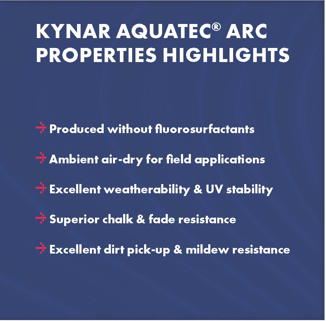 Kynar Aquatec® ARC latex is a hybrid dispersion containing, on polymer solids, 70% (wt) Kynar® PVDF resin, and 30% (wt) proprietary acrylic resin, produced without any fluorinated surfactants or alkylphenol ethoxylate (APEO). After more than 14 years of south Florida exposure, waterborne coatings based on Kynar Aquatec® ARC latex confirm weathering performance comparable to 70% Kynar 500® PVDF finishes, similar to those used in OEM baked metal finishes. Kynar Aquatec® ARC is highly reccomended for applications of field applied topcoats for metal roofing and façade restoration where the highest UV performance is required.