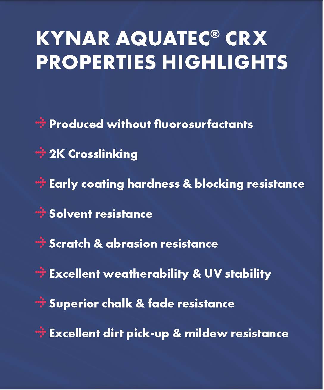 Kynar Aquatec® CRX latex is a hybrid dispersion containing, on polymer solids, 70% (wt.) Kynar® PVDF resin, and 30% (wt.) proprietary acrylic resin with free hydroxyl and acid functionality for 2K coating systems. Kynar Aquatec® CRX latex enhances early coating hardness, solvent resistance, adhesion and scratch resistance in addition to outstanding weatherability. Kynar Aquatec® CRX is produced without any fluorinated surfactants or alkylphenol ethoxylate (APEO).